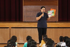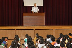 7月2日の朝礼では、最初に、あま市口腔保健賞の表彰がありました。1年生から順番に名前を呼ばれ,大きな声で返事をし、舞台に上がりました。学年代表の児童が、学年を代表して、校長先生から賞状を受け取りました。