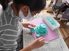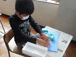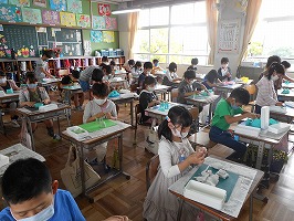 図画工作の「立ち上がれ!ねん土」に取り組みました。板状やひも状にしたねん土を立ち上げることから表したいことを見つけ、手や用具を工夫して使い、自分の想像した建物や塔などを作りました。お城や不思議な塔、神社など、一人一人が思い思いの力作を完成させることができました。