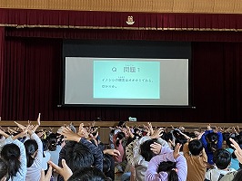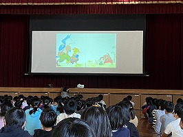11月8日(月)には、図書委員による児童集会を行いました。今年は、絵本作家の降矢ななさんの生誕60周年を記念して、「ともだち ひきとりや」の読み聞かせ集会です。降矢ななさんは、「おれたち ともだち」シリーズや「まゆとおに」などの挿絵を描いています。集会では、〇✖クイズなども行いました。図書委員は練習の成果を生かし、集会を進めることができました。