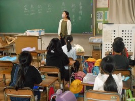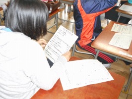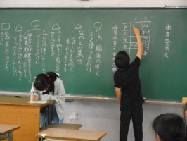 6年生の外国語では、「行きたい国はどこですか?」の質問に対する答えを一人ずつスピーチしていました。写真を指し示しながら、その国ならではの、見たり買ったり食べたりできるものを英語で堂々とわかりやすくスピーチしていて、「さすが6年生」と感心しました。また、友達の発表を聞きながらメモを取り、世界の国々に興味をもつことができました。