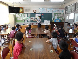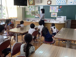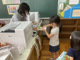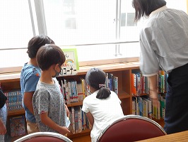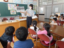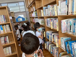図書室の使い方について、図書室の先生からお話を聞きました。始めに、絵本の読み聞かせをしていただいた後、本を読まずに読み聞かせをする、ストーリーテリングをしていただきました。子どもたちは、頭の中で絵を思いうかべながら真剣に聞いていました。そして、図書室のきまりや本の借り方、返し方を教わり、実際に本を一冊借りました。昆虫の本やテレビアニメで見たことがある本など、それぞれがお気に入りの一冊を熱心に探していました。コロナ禍のため、自宅には持ち帰らず、学校で読書を楽しみたいと思います。
