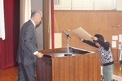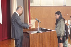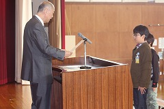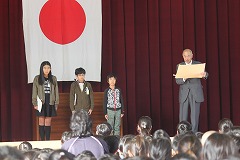 今日の朝礼では、優良児童と3R促進ポスターコンクールの表彰がありました。名前を呼ばれた児童は、元気よく返事をして壇上に上がり、校長先生から表彰状をいただきました。