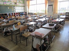 5月11日金曜日、緊急地震速報を利用したショート避難訓練をしました。今回は、緊急地震速報のブザー音を利用しました。8時32分に、「地震です。地震です」と放送が入ると、教室にいた児童は、さっと机の下にもぐり、自分の身を守りました。机の脚を持ち、頭を守りながら、しゃがみました。