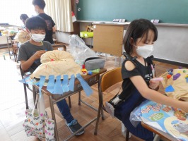 6年生は家庭科でナップザック作りをしています。今日は、ひもを通す部分を折り曲げてまち針で止め、しつけ縫いをしていました。下の布を一緒に縫ってしまわないように気をつけながら縫うことや玉止め・玉結びに苦戦していましたが、慎重に自分のペースで作業を進めていました。しつけ縫いができ上がった人からミシンで縫います。まち針で止める時に布を押さえてあげたり、わからない所は確認し合ったりと助け合う姿が見られ、良い雰囲気で集中して作品作りができました。