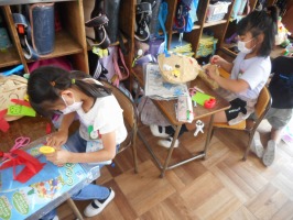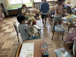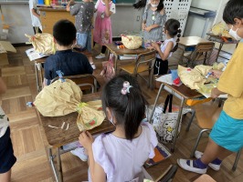 図画工作の時間にクラフト紙と新聞紙や広告の紙を使って作品を作りました。クラフト紙をくしゃくしゃにして袋状にし、中に新聞紙や広告を丸めてつめこんでぬいぐるみのように形を作っていきました。クラフト紙をしばったり、薄紙や折り紙で飾りづけをしたりして、動物や虫、乗り物などのすてきな作品ができました。