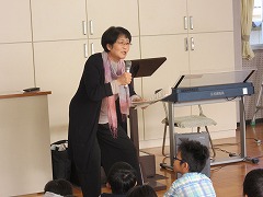 今年も、講師に堀田みどり先生にお越し頂き、合唱指導を行いました。今回は、11月にある学習発表会で歌う歌を中心に、教えて頂きました。どの学年も、声の出し方、歌う時の表情など歌を歌う時に気をつけること、曲の雰囲気にあった歌い方など、先生からの具体的な言葉がけや励ましで、だんだん上手になっていきました。合唱指導の時間を通して、歌うことの楽しさを味わい、45分が終わる頃には、歌いきった充実感で自然と笑みがこぼれました。