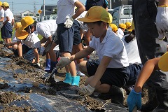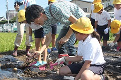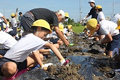 4年生を中心に、ジャガイモ種芋の植え付けを行いました。大きく育つように願いを込めて、1人3個ほど植えました。肉じゃが、じゃがバターにフライドポテト、今から楽しみです!!