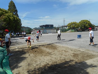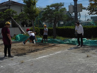5年生の体育では、幅跳びをやっていました。計測する際、踏切線から計測するので、踏切線ちょうどで踏み切れるよう繰り返し練習しました。1回1回の練習の中で、踏み切る位置がちょうどよかったのか、やや手前だったのかなどの確認や、踏み切る前は歩幅を小さくして調節することなど、アドバイスをもらいながら、自分の記録が伸びるよう練習していました。計測の際は、計測補助や整地を子どもたちが担当しよく動いてくれていました。