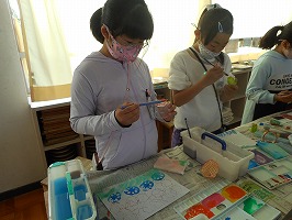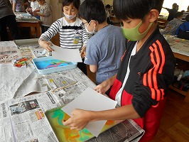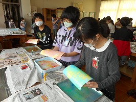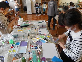 4年生の図工は、「まぼろしの花」を作成しています。今日はその花を作るための準備として、スパッタリングやマーブリング、型押しなど、いろいろな技法を使って、紙作りを行いました。みんなそれぞれに工夫をして、きれいな紙を作成することが出来ました。