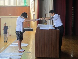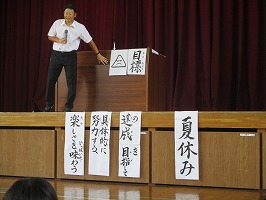 2 理科作品 表彰 夏休みに取り組んだ理科作品の表彰がありました。6人の人たちが表彰されました。テーマをもち、こつこつと取り組む姿勢は素晴らしいことです。3 校長先生のお話 今日のお話は2つです。 夏休み前に、みなさんに「~の達成をめざして、具体的に努力する楽しさをいっぱい味わう夏休み」にしてほしいと伝えていました。「~」に入る言葉は「目標」です。 私は、自転車のレースに参加しました。残念ながら過去最低の記録(タイム)でした。準備のときに体調を崩したこともあり、「目標」の自己ベストは達成できませんでした。しかし、「目標の達成を目指して、具体的に努力する楽しさをいっぱい味わう」という『目的』は十分達成できました。達成感を味わいました。甲子園球児もそうです。目標は勝つことですが、全国大会で優勝できるチームは1チームだけです。しかし、みんな目的は達成していたと思います。 2つめのお話です。昨日、「スーパーブルームーン」を見ましたか(たくさんの挙手がありました)。私は、知ってはいましたが、見忘れてしまいました。これは、「世の中には、『スーパーブルームーン』はあったけれど、見忘れた私にはなかった」ということになります。この話を人間の話に置き換えるとこうなります。「みんな一人一人に良いところ、素晴らしいところがあります。でも、あなたがそのところを知らなければ、月と一緒であなたにとっては無いことになります。」でも、絶対にあるのです。自分の良さを、自分で見つけて育てましょう。友だちや先生も見つけ合って育て合っていくようなⅡ期にしていきましょう。 たくさんほめ合っていきましょう。一方で、いけないことは、たくさんしかってもらいましょう。 9月からも『かしこく やさしく たくましく』、『いじめなし』。 みんなで、さらにすばらしい篠田小学校にしていきましょう。