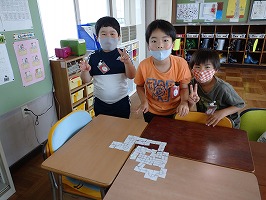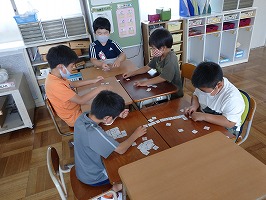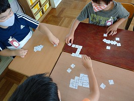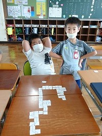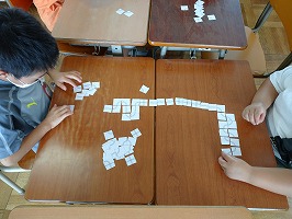 なのはな学級2年生の皆で、教科書98ページのわくわく算数ひろばを学習しました。線路カードを使って、教科書に載っている線路や、複雑な線路をグループで協力してつくりました。楽しんで活動することができました。