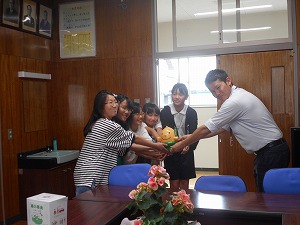 先週、児童会役員が中心となって、朝の時間に各教室をまわり「緑の羽根」の募金活動を行いました。各教室を回る際に、募金箱にお金を入れやすいようにしゃがんであげたり、募金してくれた人にお礼をいったりと優しい心配りができました。今日は、集まった募金を市役所の農政課の方が取りに来てくださるということで、校長室で児童会役員が直接、農政課の方に募金をお渡ししました。このお金は、花の購入や緑化活動などに役立てられるそうです。ご協力いただき、ありがとうございました。