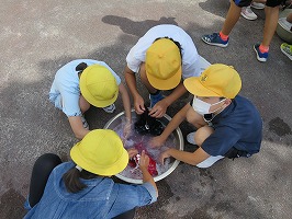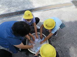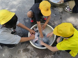 6年生の家庭科の授業では、洗濯をやっています。たらいを使って手洗いの実習を行いましたが、洗濯機がやっている「洗い」と「すすぎ」の工程を行ったことで、洗濯の仕方をしっかりと学ぶことができました。