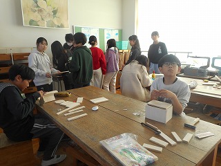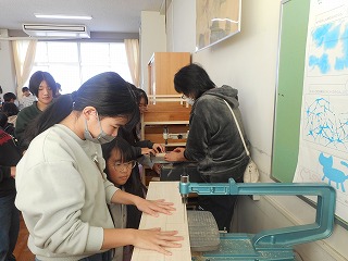 1枚の板から、自分が作りたいものを考えて設計しました。大きさも形も用途も様々で、1枚の板に込められた思いやアイデアがつまっているようでした。糸のこを使って板を切る時には、ずれてしまわないように集中して板を動かします。スタートとストップのボタンは、後ろに並んでいる人にお願いします。声をかけ合い協力して作業を進める姿がすばらしかったです。切り終わった板はやすりで磨いて表面をきれいにして、釘を打ったりボンドで貼り付けたりして、完成に向けて真剣な表情で作品作りを進めていました。