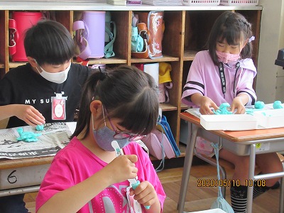 楽しかったことやうれしかったこと、がんばったことなどの様子を思い出しながら、ねん土で作りました。ねん土をひねり出したり、へらを使ったりして形を作りました。