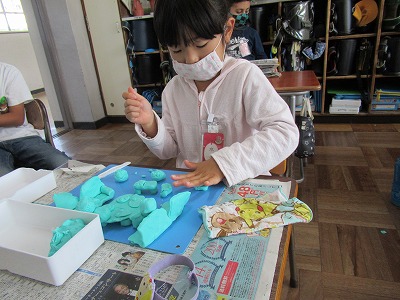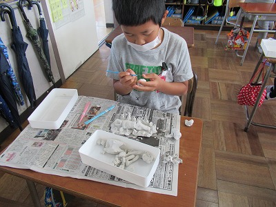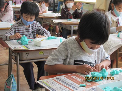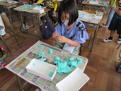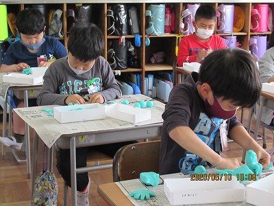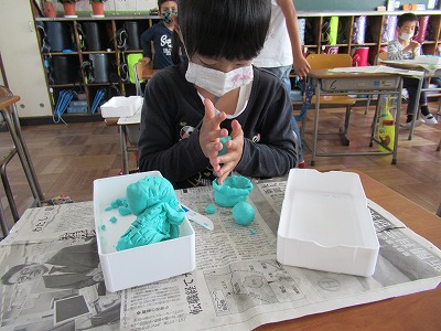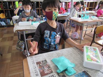 2年生は図工で、ねん土を使って「おもいでをかたちに」の作品作りをしました。