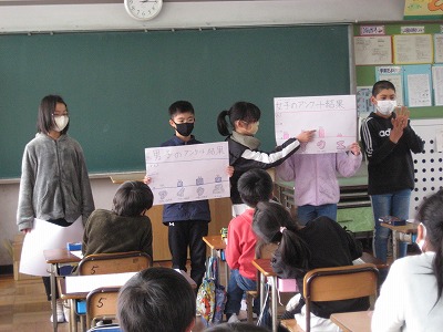 自分たちの生活を振り返り、疑問に思ったことや周りの人に聞いてみたいことなどについて、アンケートを作って調査しました。