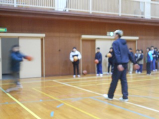 5年生の体育では、バスケットボールをしていました。はじめに、縄跳びをして体を動かし温めました。次に、手からボールが離れないように気をつけながら、ボール慣らしの運動をしました。それから、4人組で、チェストパス・バウンズパス・オーバーハンドパスを5周ずつ右回り・左回りとテンポよく行い、早く終わった班からシュート練習をしました。最後に、斜めに三角に分割した4つの三角バスケットコートで、攻めと守りを交代しながら、試合形式でパスをつなぐ練習をしました。見本を見て、どんな練習をするのか全員がわかって練習していたことやチームごとに声をかけ合って自分たちで練習を進めていたことがとても良かったです。