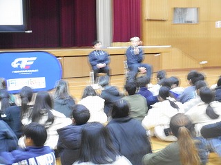 ファイティングイーグルスの選手2名が、地域貢献活動で篠田小学校にやって来ました。昇降口であいさつ活動をした後、5・6年生児童と交流会を行いました。ダンクシュートや超ロングシュートなどプロの技を見せていただいた後、全員が選手にパスを出していただいて、レイアップシュートに挑戦しました。「おしい」「ナイスシュート」と声をかけてもらっている子もいました。また、代表児童5人が1チームとなり、選手2名と試合形式でプレイしました。1分半交代で4チームが対戦させていただきました。見ている児童も友達を応援し、シュートが決まる度に歓声があがり、おおいに盛り上がりました。最後に、質問形式で小学校の頃の話、プロになるまでの話などについてお話を聞きました。夢に向かってがんばっている人のかっこよさ、夢をかなえるためにつらいことがあっても乗り越える強さを感じる機会となりました。