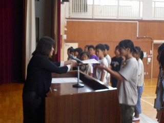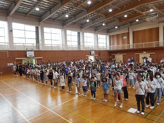 今日から後期がスタートします。はじめに、学校の新しいリーダーとなる後期児童会役員と学級委員の認証、そして、読書感想文コンクールの表彰を行いました。次に、後期のスタートに際し、言葉について話をしました。学校では、たくさんの人が一緒に生活・学習をします。だからこそ楽しいこともあるけれど、思い通りにいかなくて嫌な思いをすることもあります。けれども、人を傷つける言葉で嫌な空気をつくってしまうより、相手が「うれしい」気持ちになるような言葉を使うことを心がけ、よりよい学級・学校にしていきましょうと話しました。最後に、全校で元気よく校歌を歌い、後期がスタートしました。