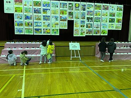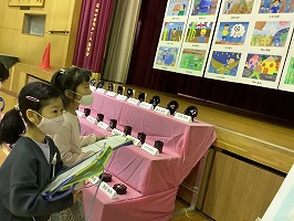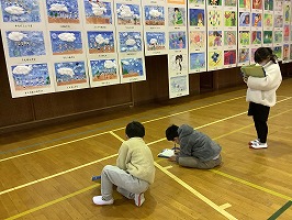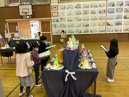 今日は、児童鑑賞日。普段見る体育館はとちがい、そこはまるで美術館!他学年の作品をうれしそうな表情で、じっくりと鑑賞していました。