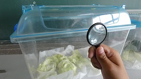 理科では「チョウを育てよう」の学習をしています。学校の花壇に植えてあるキャベツやブロッコリーの葉に付いていたチョウの卵を取ってきて、教室で成長の様子を観察しています。