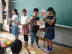 2年生の算数では、持ち寄った空き箱を使って「はこの形」の面や辺、頂点について学習していました。面の数、辺の数、頂点の数を重複して数えてしまわないように、面に貼り付けた画用紙に印をつけながら数えていました。印をつけることで正確に数えることができました。その後、辺の長さにも着目して長さが同じ辺が4本ずつであることも確かめました。