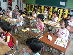 今日の国語は、楽しみにしていたお店やさんごっこの1回目です。文房具屋さんには、ハサミやのり、連絡帳などが、パン屋さんには、サンドイッチやカレーパン、ホットドックなどが、机いっぱいに並んでいます。先生の合図でお店屋さんが開店し、50円や100円で15分間、お買い物をしました。「いらっしゃいませ、おいしいケーキありますよ」とお客さんに声をかけたり、「50円で買えるものありますか」と聞かれ「これが50円です。」と答えたりお店の人とお客さんになりきって話すことができました。商品カードを作る時には、物の名前を書いて語彙を増やすことができ、片付ける時には、お店ごとに商品を分けて、レタスやトマトが野菜の仲間、タイやマグロが魚の仲間であることを認識でき、お店屋さんごっこを楽しみながら、多くのことを学ぶができました。