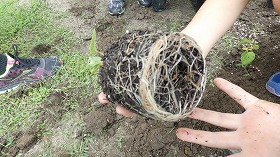 5月に植えた種も芽を出し、大きく育ってきました。育苗ポットから取り出し、白く広がった根の様子に、「もじゃもじゃだね!」「根ってこうなっているんだね」と驚きの声があがりました。