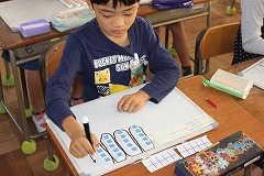 単元名は、かけ算(1)です。2,3,4,5の段の九九を使って、基準量が後に示された適応題を解くことができるように、児童たちは集中して臨みました。ホワイトボードの上で、数図ブロックを操作したり、マーカーで囲んだりしながら、「何個の何倍」をとらえてから立式することができました。