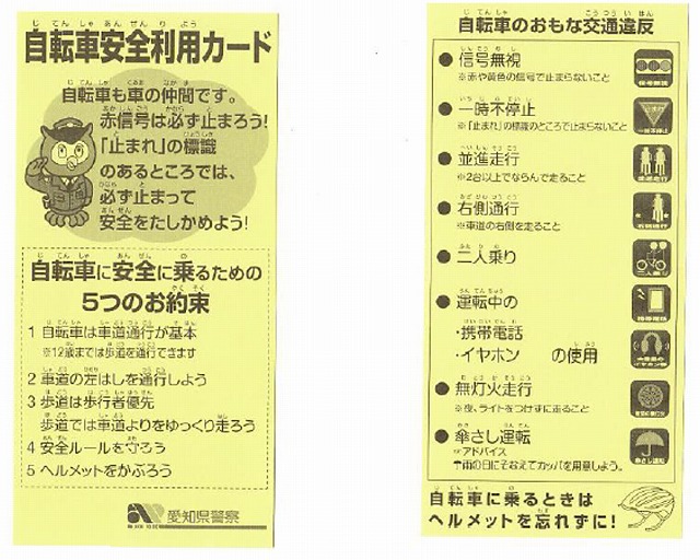 愛知県では、令和3年10月1日から「自転車の安全で適正な利用の推進に関する条例」が全面施行されました。県内では、10月初旬に自転車乗車中の小学生が自動車にはねられ、重篤なけがを負う事故が発生するなど、自転車乗車中の事故が多く発生しています。