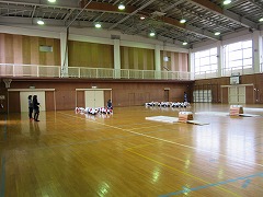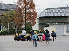 運動場で遊んでいた児童は、運動場の真ん中に集まり、頭を守り、しゃがみました。体育館で体育の授業をしていた1年生は、先生の指示に従ってその場にしゃがみました。