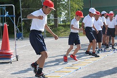 6年生の体育は、サッカーの練習をしていました。まずは、ボールタッチでボールに慣れ、鬼ごっこ形式でボールを走りながら蹴る練習をしました。次にパス練習。ボールを止めてから蹴ること、靴の内側で蹴ることの2つのポイントに気をつけて行いました。そして、2人でパスしながら前進し、ゴールめがけてシュートする練習をしました。最後に縄跳び集会に向けて大縄跳びの練習をしました。先生の指示を聞いてさっと動くことができるので、テンポよく練習が進んでいきました。「さすが6年生」です。