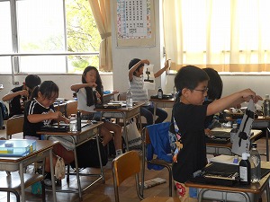 2回目の避難訓練は、大きな地震が起こり、理科室から出火したため運動場に避難するという想定で行いました。今回は消防署の方に来ていただき、放送を聞くこと、「おはしも」の約束を守ることの大切さを教えていただきました。そして、すばやく静かに避難できたことをほめていただきました。その後、2年生は、煙体験を行い、煙が立ち込めると全く周囲が見えなくなることを知りました。4年生は、水消火器を使って消火器の使い方を教えていただきました。