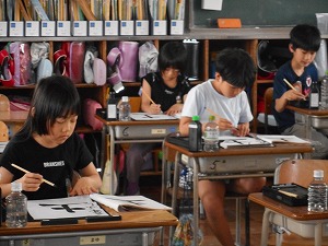 3年生の書写は「土」の字の2回目でした。横画と縦画の十字に交わる時に縦画が長すぎたり短すぎたりしないよう注意して書きました。今日は1枚提出ということもあり、真剣な表情で一筆一筆丁寧に書き、最後に小筆で学年と名前も書きました。まだ3年生なので、手が真っ黒になったり筆を落としてしまったりすることもありますが、一生懸命書いた文字を提出する際、「ここがいいね」「うまくなったね」と声をかけられ、うれしそうでした。