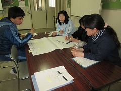 図上訓練では、3つのグループに分かれ、役割分担を決めました。その後、養護教諭からの事例を聞き、役割ごとにどんな行動をとったらよいかについて考え、付箋に書き、模造紙に貼ってまとめました。