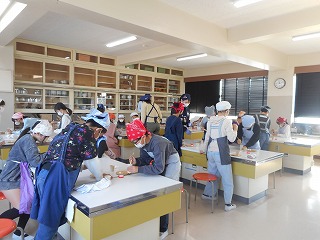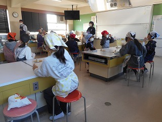 5年生の出前授業では、バター作りをしました。まずは、容器に入ったクリームを音がしなくなるまで振り続けます。その後、水分が出てくるまで割りばしでかきまぜ続けます。容器をふるのも割りばしでまぜるのも大変なので、二人で交代しながら行いました。水が出るまでかきまぜたら、さらに10回ぐらいかきまぜ容器の端によせたらできあがりです。最後に、自分たちで作った手作りバターの試食をしました。でき上がったバターの水分であるバターミルクと固形の無塩バター、後から塩を混ぜた有塩バターと3種類の味の違いを楽しみました。普段とは違う体験ができ、楽しい学びの時間となりました。