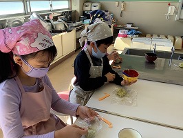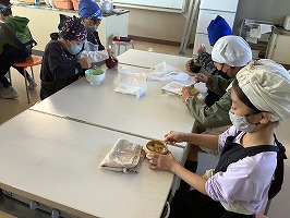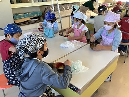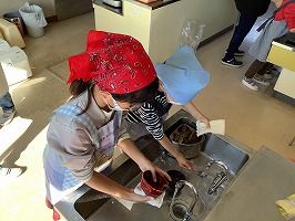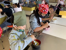 エプロンをして家庭科室での調理に子どもたちは大喜び。蒸かしたサツマイモをつぶし、砂糖を混ぜます。「どれくらいの甘さにしようかな」「しっかり混ぜなきゃね」と、楽しそうに活動する姿が見られました。自分が使った用具も自分で洗います。