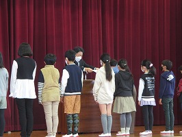 2年生の外国語活動では、run、sleep、swimなどの動作を表す言葉とrabbit、dog、fishなど生き物の名前を表す言葉を発音する練習をクイズ形式で行っていました。じゃんけんで勝った代表の子が行う動作がどのカードをあらわしているか考えて当てます。答えは英語で言わなければならないので、繰り返すことで自然に英単語を覚えます。また、正解すると、ALTの先生の発音をまねして確かめるので、正しいイントネーションも覚えることができます。問題を出したい子も答えが言いたい子もたくさんいて、大いに盛り上がっていました。