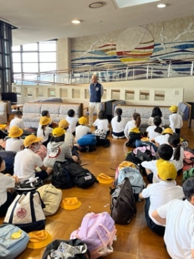 2回目の避難訓練は、大きな地震が起こり、理科室から出火したため運動場に避難するという想定で行いました。今回は消防署の方に来ていただき、放送を聞くこと、「おはしも」の約束を守ることの大切さを教えていただきました。そして、すばやく静かに避難できたことをほめていただきました。その後、2年生は、煙体験を行い、煙が立ち込めると全く周囲が見えなくなることを知りました。4年生は、水消火器を使って消火器の使い方を教えていただきました。