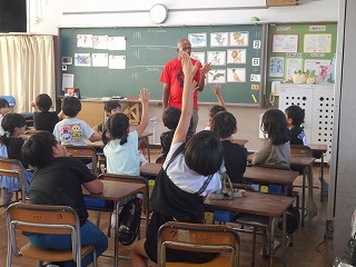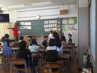2年生の外国語活動では、run、sleep、swimなどの動作を表す言葉とrabbit、dog、fishなど生き物の名前を表す言葉を発音する練習をクイズ形式で行っていました。じゃんけんで勝った代表の子が行う動作がどのカードをあらわしているか考えて当てます。答えは英語で言わなければならないので、繰り返すことで自然に英単語を覚えます。また、正解すると、ALTの先生の発音をまねして確かめるので、正しいイントネーションも覚えることができます。問題を出したい子も答えが言いたい子もたくさんいて、大いに盛り上がっていました。