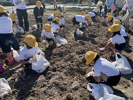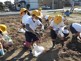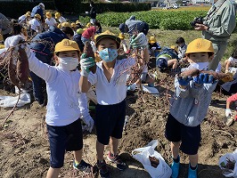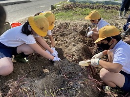 10月20日、強風の中でしたが1年生から3年生までの児童がサツマイモの収穫をしました。5月の苗植えは畑の状態が悪くて体験することができずに残念でしたが、今日の収穫は思いっきり楽しむことができました。5、6個ついた茎を引き抜いた児童も何人かいました。豊作にみんな大喜びでした。ここまで育てて下さった農業委員さんに感謝です。各学年、調理実習をして、みんなでサツマイモを味わいたいと思います。
