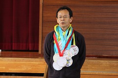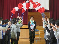 講話の後、児童会が中心となって、教頭先生への感謝の会が行われました。校長先生の話、教頭先生へメダルのプレゼント、教頭先生へのお礼の気持ちを込めて全校合唱を行いました。合唱後、教頭先生から、元気な挨拶など篠田っ子のよいところについての話を聞きました。最後に、教頭先生をアーチで見送りました。