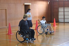 6年生は、体育館で車椅子体験をしました。二人一組になり、車椅子での段差越える体験をするために、マットの上を車椅子で通ったり、実際にカラーコーンを車椅子で回ったりしました。押す人は、段差を上がるときや段差から降りるときには、車椅子を押す人が乗っている人に声をかけるとびっくりさせなくてすむことなどを教えていただきました。