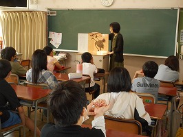 2回目の避難訓練は、大きな地震が起こり、理科室から出火したため運動場に避難するという想定で行いました。今回は消防署の方に来ていただき、放送を聞くこと、「おはしも」の約束を守ることの大切さを教えていただきました。そして、すばやく静かに避難できたことをほめていただきました。その後、2年生は、煙体験を行い、煙が立ち込めると全く周囲が見えなくなることを知りました。4年生は、水消火器を使って消火器の使い方を教えていただきました。