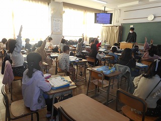 6年生の国語では、目的や条件に応じて話し合うことをねらいに学習しています。今回は、「1年生とみんなで楽しく過ごすためにどうしたらよいだろう 」というテーマで話し合い、グループごとに1年生に喜んでもらえるような遊びを考えました。転がしドッジや空気砲、動く的あてゲームなど、工夫をこらした遊び道具がたくさん並びました。説明する時にしゃがんで説明したり、的に命中したら「すごい」とほめてあげたりと、1年生のことを考えて進めているのを見て、「さすが6年生だな」と感心しました。今日は、6年生と1年生の1組が交流しましたが、6年2組と1年2組は水曜日に交流する予定です。