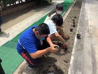 学校ボランティア&PTAの方々に水を撒いていただく苗を植え替えるの図