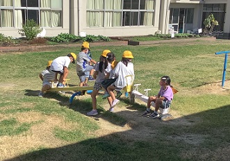 シーソーの中央に✕印のテープが