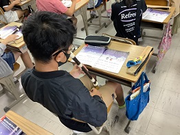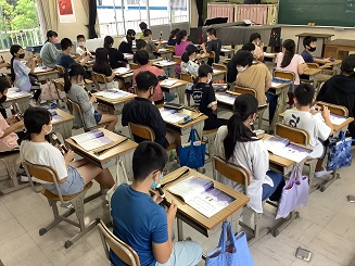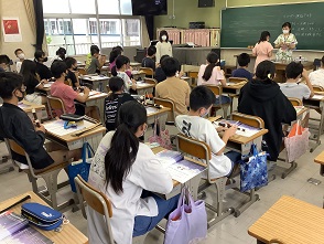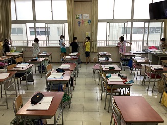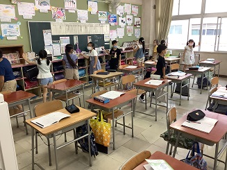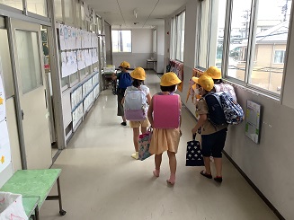 もうひとつ3年生さん、メジャーで教室の周りの長さを測ってます