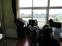 天気の変化を調べるために雲を撮影しています。「雲の層が撮れたよ」「今日の雲はねずみ色だね」など、お互いのタブレットを見せ合いながら情報を共有する様子が良かったですね